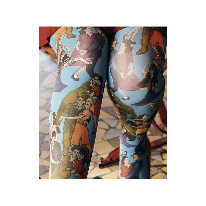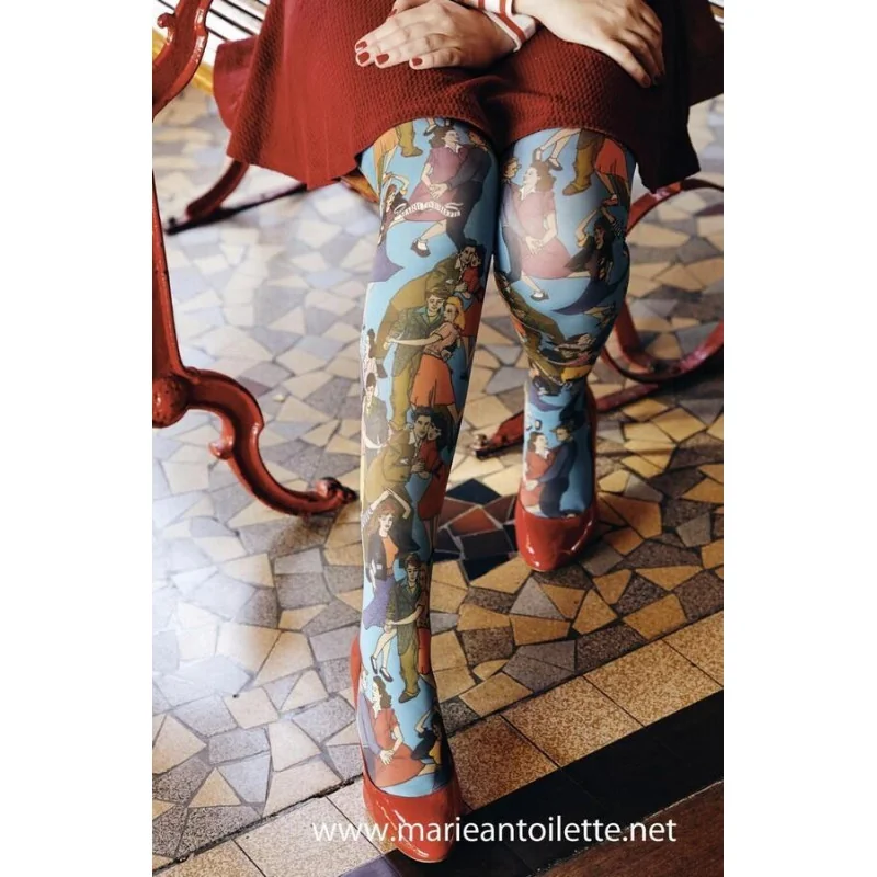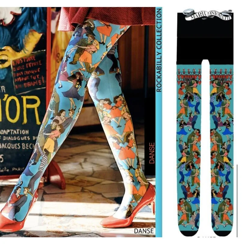 Ce collant fantaisie est une crĂ©ation originale de Marieantoilette sur le thème de la danse que ça swing que çà rock , on en a tout le repertaoire, les jambes sont transformĂ©es en piste de danse façon Bande dessinĂ©es, le style et les couleurs sont un petit clin d’oeil Ă l’univers des annĂ©es 60 , ou les vibrations des dĂ©buts du rock et des yĂ©-yĂ© faisaient danser les foules…
