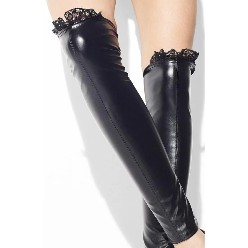 Girardi fabrique ce belles chaussettes hautes sans pieds sur une base de faux cuir en sky souple, la finition de dentelle sort directement des usines de filature de dentelle de France.