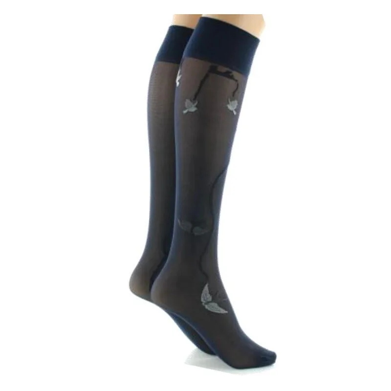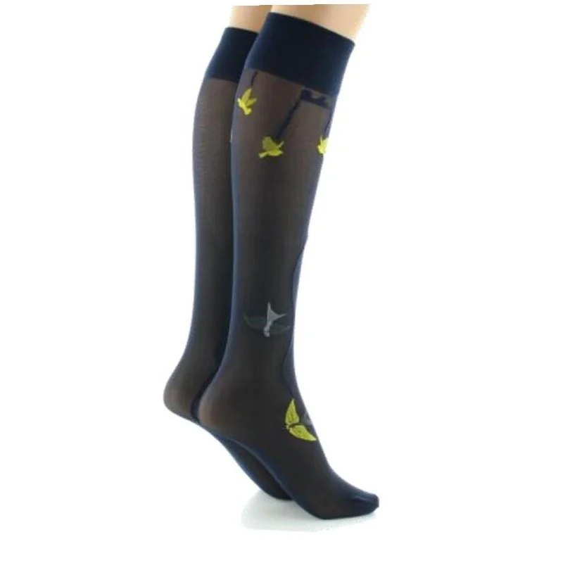 Les Mi bas Berthe aux grands Pieds sont disponible en base marine aux oiseaux Gris; base marine avec les oiseaux jaunes, et base noires avec les motifs vert d’eau